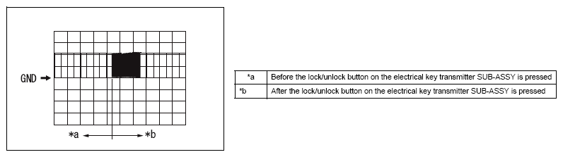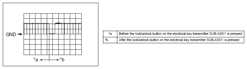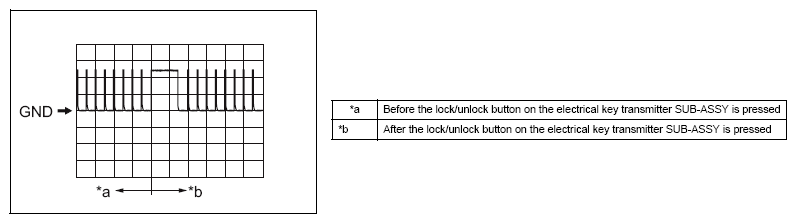 (1) For a detailed description on outside the entry function detection area, refer to "OPERATION CHECK ". (Refer to ) (2) For a detailed description on inside the wireless function operating range, refer to "OPERATION CHECK ". (Refer to ) - Using an oscilloscope, check waveform 6. See Fig 7NOTE: The oscilloscope waveform shown in the figure is an example for reference. The noise and chattering are not shown in the figure.