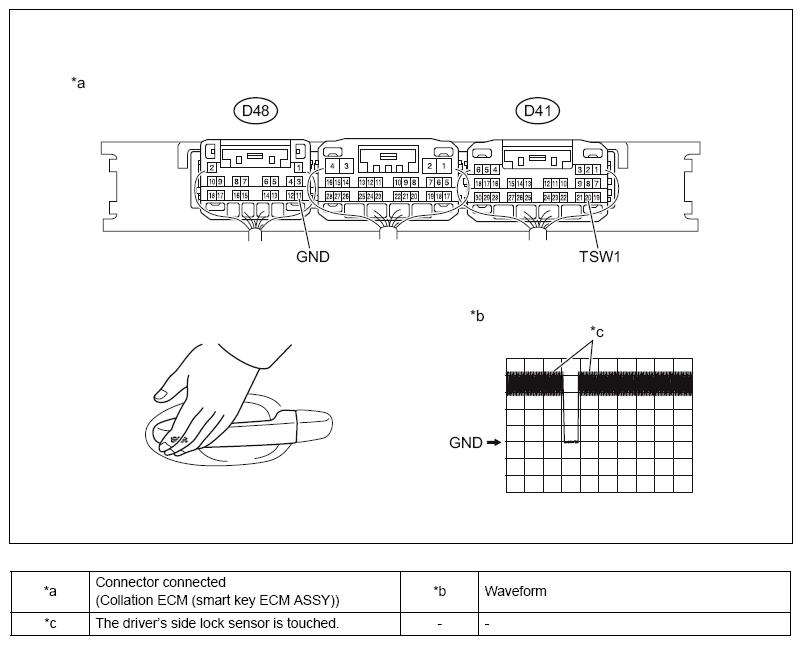 2 V/DIV., 500 ms/DIV. Pulse generation (Refer to the waveform). See Fig 1. NG: Replace the front door outer handle assembly (driver's door).