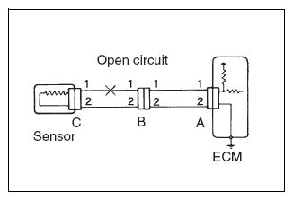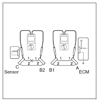 - For cases shown in Fig 9, there is an open circuit between terminals 1 of connectors B2 and C if the resistance between terminals 1 of connectors A and B1 is less than 1 Ω, and the resistance between terminals 1 of connectors B2 and C is 10 kΩ or more (open circuit).