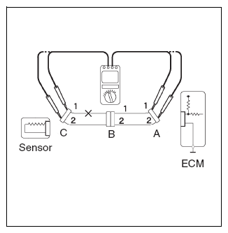 NOTE: Measure the resistance while lightly shaking the wire harnesses up/down and left/right. - For cases shown in Fig 8, there is an open circuit between terminals 1 of connectors A and C if the resistance between terminals 1 of connectors A and C is 10 kΩ or more (open circuit), and the resistance between terminals 2 of connectors A and C is less than 1 Ω.