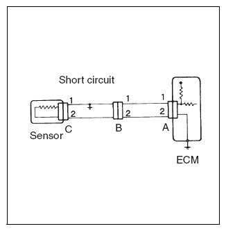 - For cases shown in Fig 12, there is a short circuit between terminals 1 of connectors A and C if the resistance is less than 1 Ω(short circuit) between terminal 1 of connector A and chassis ground, and the resistance between terminal 2 of connector A and chassis ground is 10 kΩ or more.