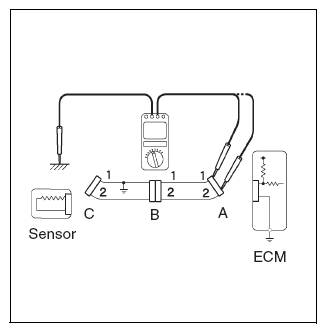 - Disconnect connectors A and C, and measure the resistance between terminals 1 and 2 of connector A, and chassis ground. Standard value: 10 k Ωor more