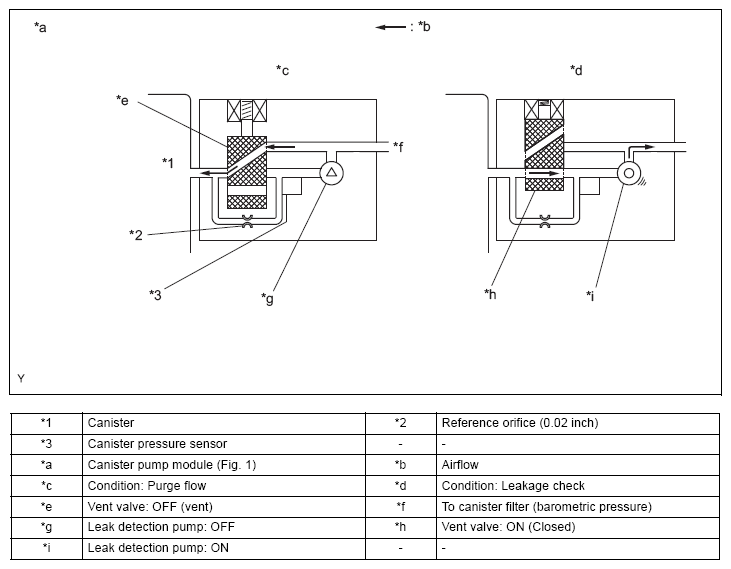 | (a) Vent valve | Ventilates and closes the EVAP system. When the ECM turns on the valve, the EVAP system is closed. When the ECM turns off the valve, the EVAP system is ventilated. Closes the purge VSV, turns the vent valve to ON (close), and operates the leak detection pump. In order to inspect for EVAP leakage, build up negative pressure (vacuum) into the EVAP system. (Fig 1) |