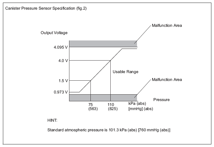 | (b) Canister pressure sensor | Indicates pressures such as voltage. The ECM applies the adjusted 5 V to the pressure sensor and monitors the EVAP system pressure using the feedback from the sensor. (Fig 2) |