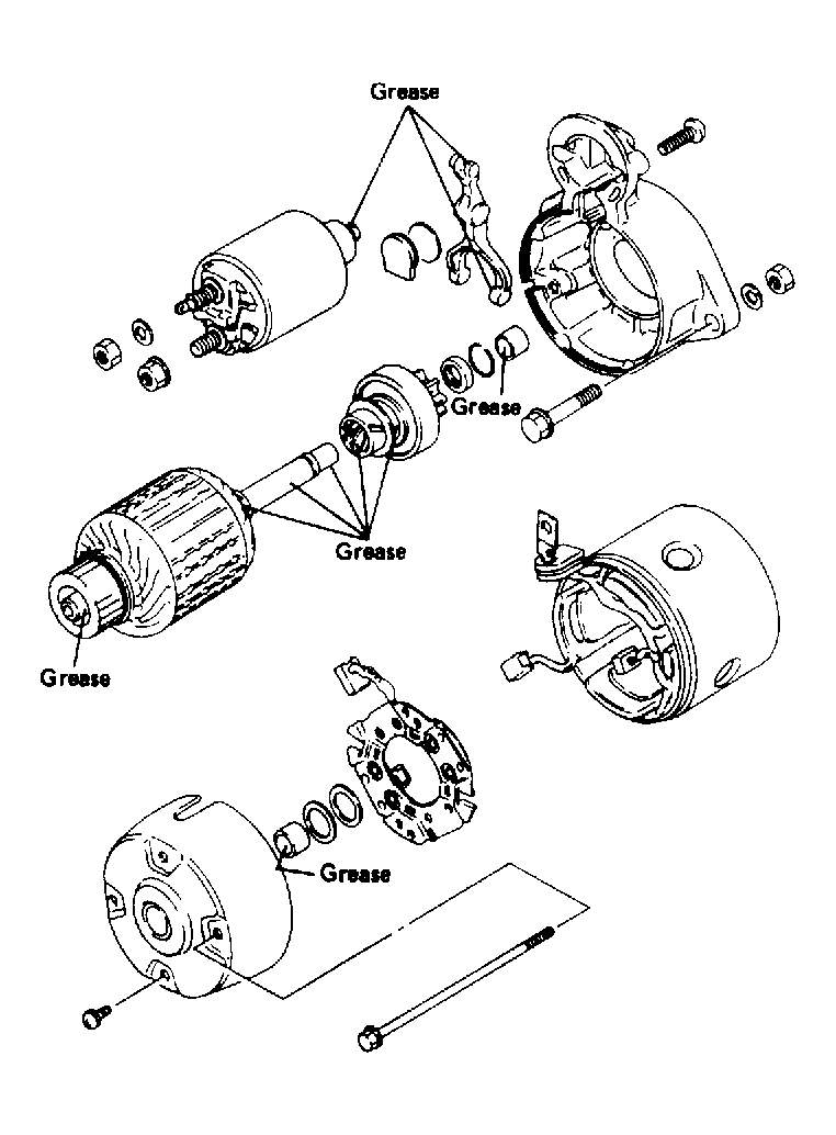 - Lubricate all surfaces as shown in Fig 1. Install over-run clutch, stop ring and armature ring (if removed). Install brushes into brush holder. Align yoke and drive housing onto starter housing and install.