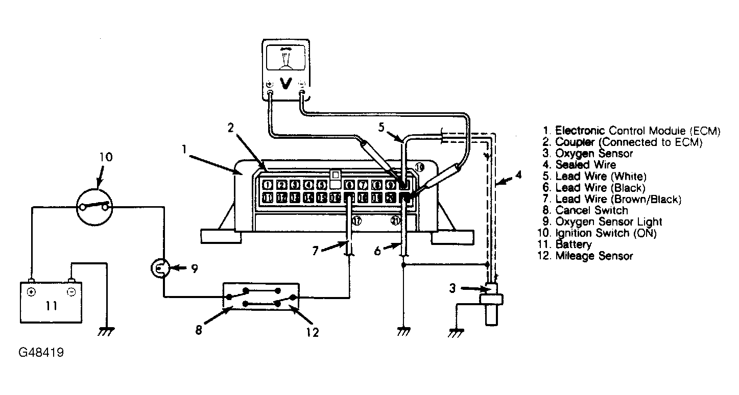 - To check feedback to oxygen sensor from the ECM, turn oxygen sensor light switch off. See Figure . Using an ohmmeter, connect positive probe to body ground and negative probe to terminal No. 17 of ECM unit. Ohmmeter indicator should deflect. If not, reverse polarity of ohmmeter probes. Turn oxygen sensor light switch on. Sensor light should flash. If not, wiring harness, light bulb or oxygen sensor switch may be defective.