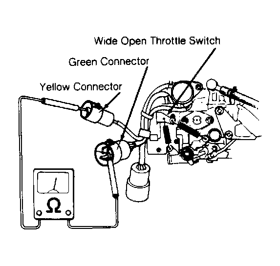 Attach ohmmeter to Green connector and Yellow connector. See Fig 1 . Ohmmeter should indicate zero. Rotate throttle to the wide open position. Ohmmeter should indicate infinity. If not, replace wide open throttle switch.