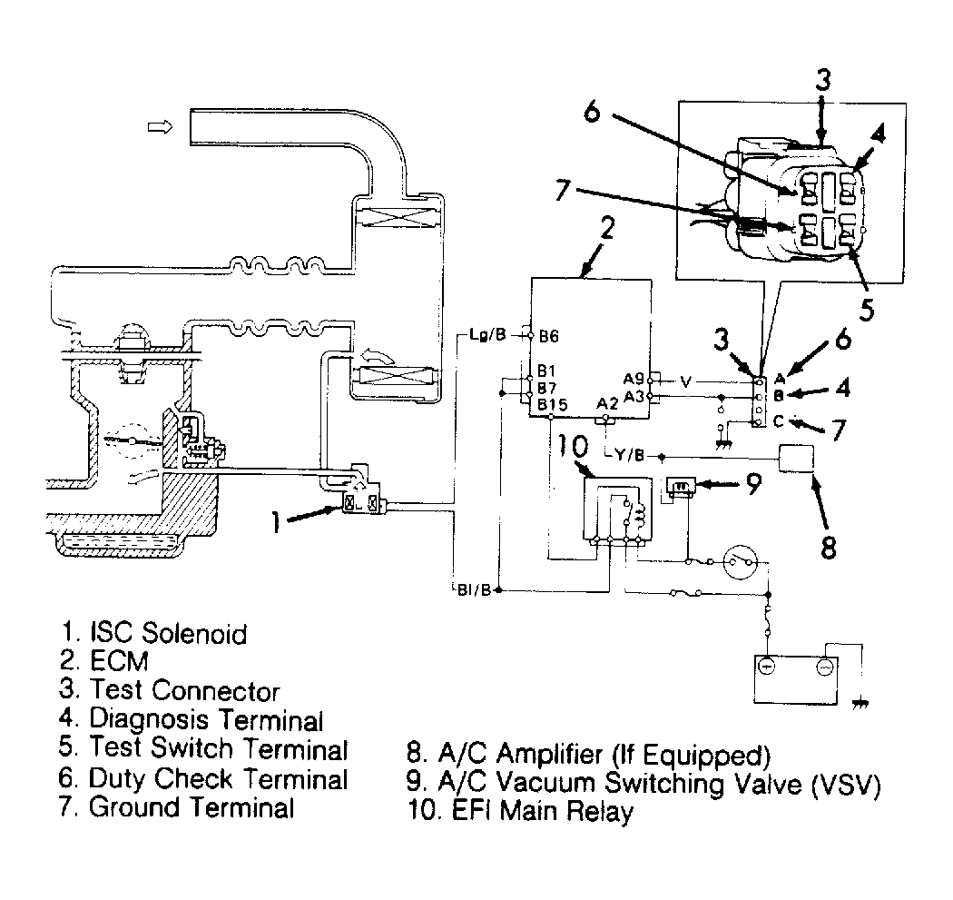 - Ensure no vacuum leaks are present in the air intake system and/or A/C Vacuum Switching Valve (VSV). Adjust idle speed and ISC duty. See ADJUSTMENTS article in the ENGINE PERFORMANCE Section. If idle speed cannot be adjusted, check air valve. See AIR VALVE under IDLE CONTROL SYSTEM.