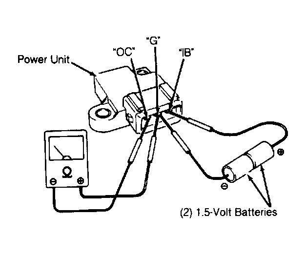 - To check power unit resistance, turn ignition off. Remove power unit from under ignition coil. Tape together two 1.5-volt batteries in series to create a 3-volt power source. Install leads to 3-volt power source. Apply negative lead to "G" terminal and positive lead to terminal IB of power unit. See Fig 2 .