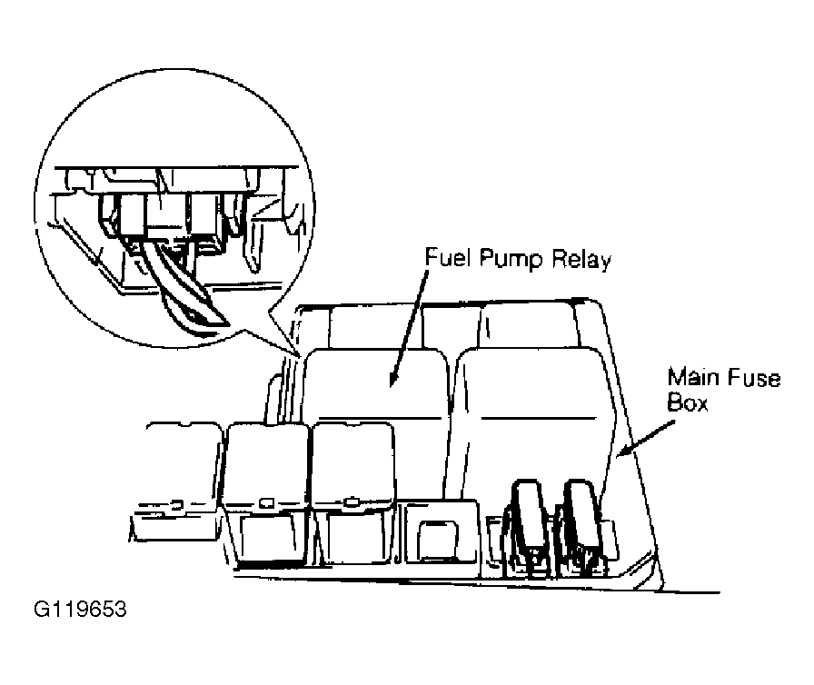 - Main fuse box is located near battery. Disconnect main fuse box from body. Disconnect fuel pump relay connector. See Fig 1 . Remove fuel filler cap to release fuel vapor pressure in fuel tank. Reinstall fuel filler cap.