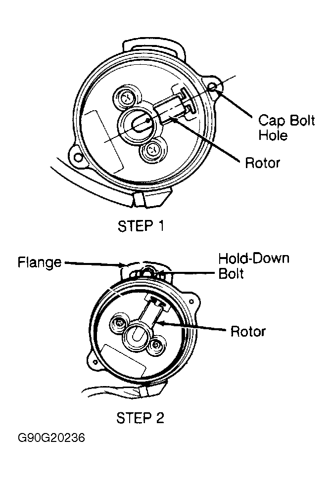 - Turn crankshaft (clockwise direction) until cylinder No. 1 is at TDC of compression stroke. Align rotor with center of cap bolt hole. See Fig 1