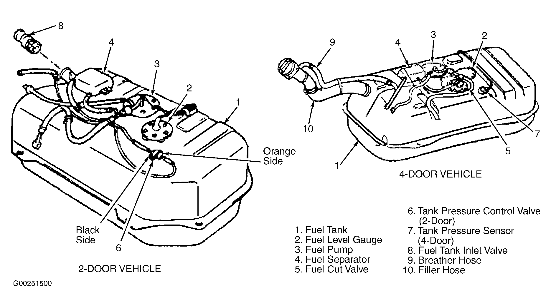 - Install fuel separator, inlet valve and tank pressure control valve (2-door vehicle) to fuel tank directing tank pressure control valve Black nozzle toward fuel separator.