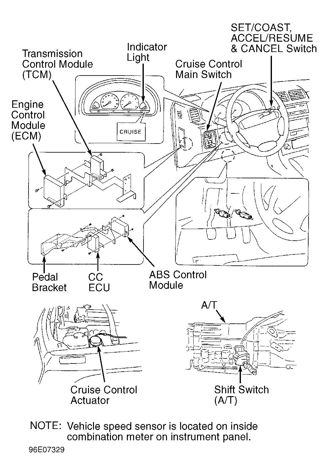 CAUTION: When performing the following diagnosis and testing procedures, it may be necessary to disconnect electrical connector from Cruise Control Electronic Control Unit (CC ECU) if instructed. Ensure ignition is off before disconnecting electrical connector at CC ECU. The CC ECU is located in different locations and contains an 18-pin electrical connector. SeeFigure . DO NOT  apply test equipment directly to CC ECU terminals or CC ECU may be damaged. Connect voltmeter or ohmmeter probes from wire harness side of connector only.
