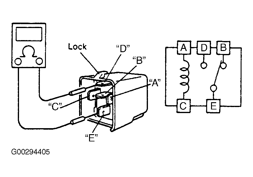 - Using jumper wires, apply battery voltage to relay terminals "A" and "C". Continuity should now exist between relay terminals "D" and "E". Replace ABS fail-safe relay if it does not test as specified.
