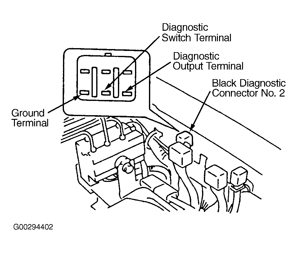 - Locate Black diagnostic connector No. 2 on left side of engine compartment. Install jumper wire between diagnostic connector No. 2 diagnostic switch terminal and ground terminal. See Figure . Turn ignition on and check if ABS warning light indicates DTC 12 (normal condition). If DTC 12 is not displayed, repair fault. If DTC 12 is displayed, go to next step.
