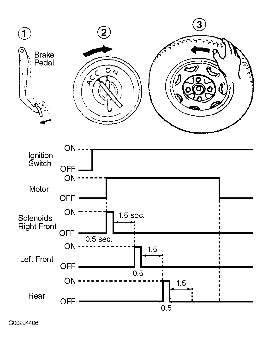 - Turn ignition off. Depress brake pedal and turn ignition on while assistant spins each wheel, one at a time. Operating sound of solenoid should be heard and each wheel should turn for about .5 second after ignition is turned on. Pump motor should be heard and pedal pulsation should be felt at this time. See Fig 1 .