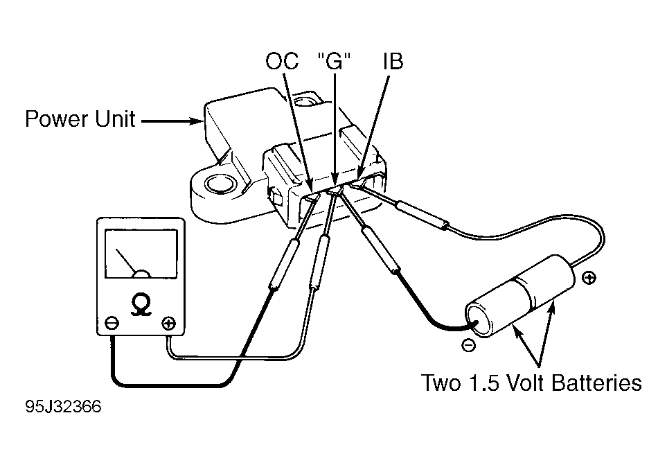 - To test ignitor, turn ignition off. Remove ignitor from its bracket. Connect two 1.5-volt batteries in series (3 volts). Connect a jumper wire from ignitor terminal "G" to negative side of batteries. Connect another jumper wire from ignitor terminal IB to positive side of batteries. See Fig 1