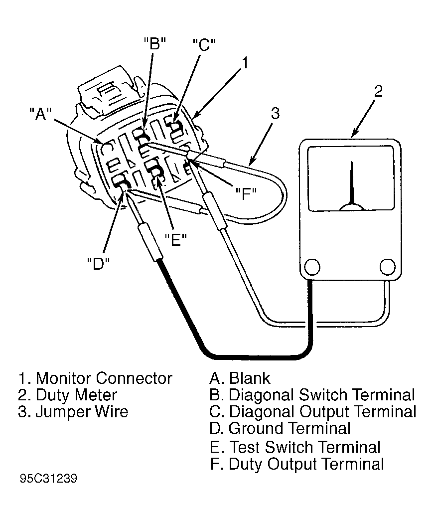 2. Allow engine to reach normal operating temperature. Connect tachometer. Using a jumper wire, connect monitor connector terminal "D" (ground) to terminal "B" (diagnostic switch). Connect duty meter between terminal "D" (ground) and terminal "F" (duty output). See Fig 1 .
