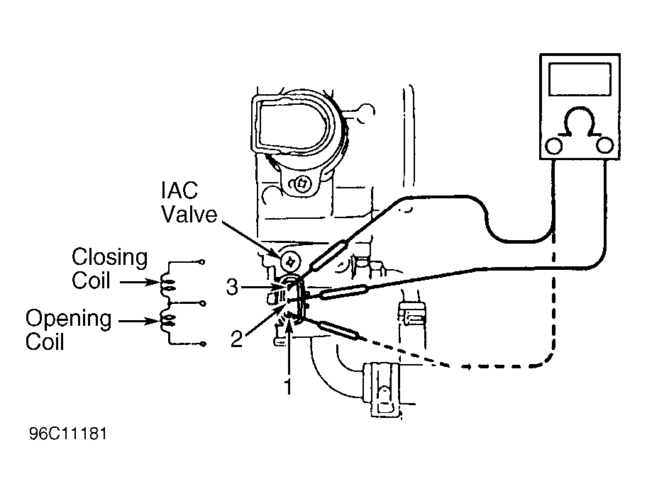 - Using fused jumper wires, connect battery voltage to terminal No. 2 of IAC valve. Connect terminal No. 1 to ground. Open throttle valve and blow air into IAC valve hose. Air should flow through valve. Switch ground lead to terminal No. 3. Air should not flow through IAC valve. Replace IAC valve if it does not operate as specified. If IAC valve does operate as specified, check Red/White wire, Red/Yellow wire, and Red/Black wire between IAC valve and PCM for an open or short. Repair as necessary. If wires are okay, replace PCM. Retest system.