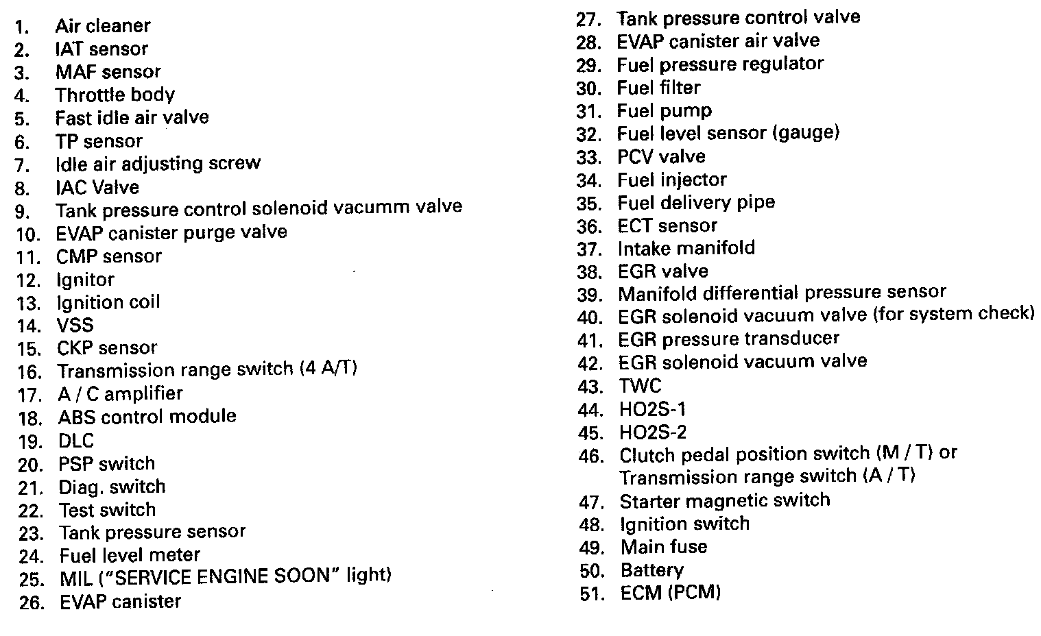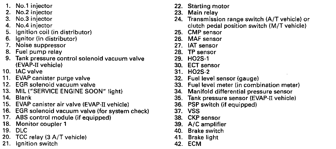 ELECTRONIC CONTROL SYSTEMThe electronic control system consists of 1) various sensors which detect the state of engine and driving conditions, 2) ECM (PCM) which controls various devices according to the signals from the sensors and 3) various controlled devices.