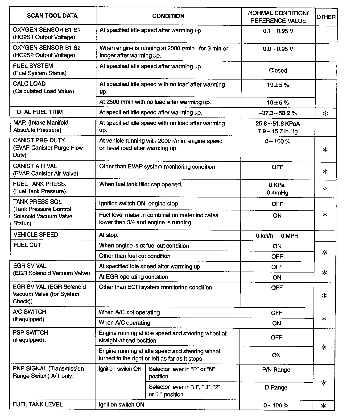 Also, conditions in the below table that can be checked by the scan tool are those detected by ECM and output from ECM as Commands and there may be cases where the engine or actuator is not operating (in the condition) as indicated by the scan tool. Be sure to use the timing light to check the ignition timing.