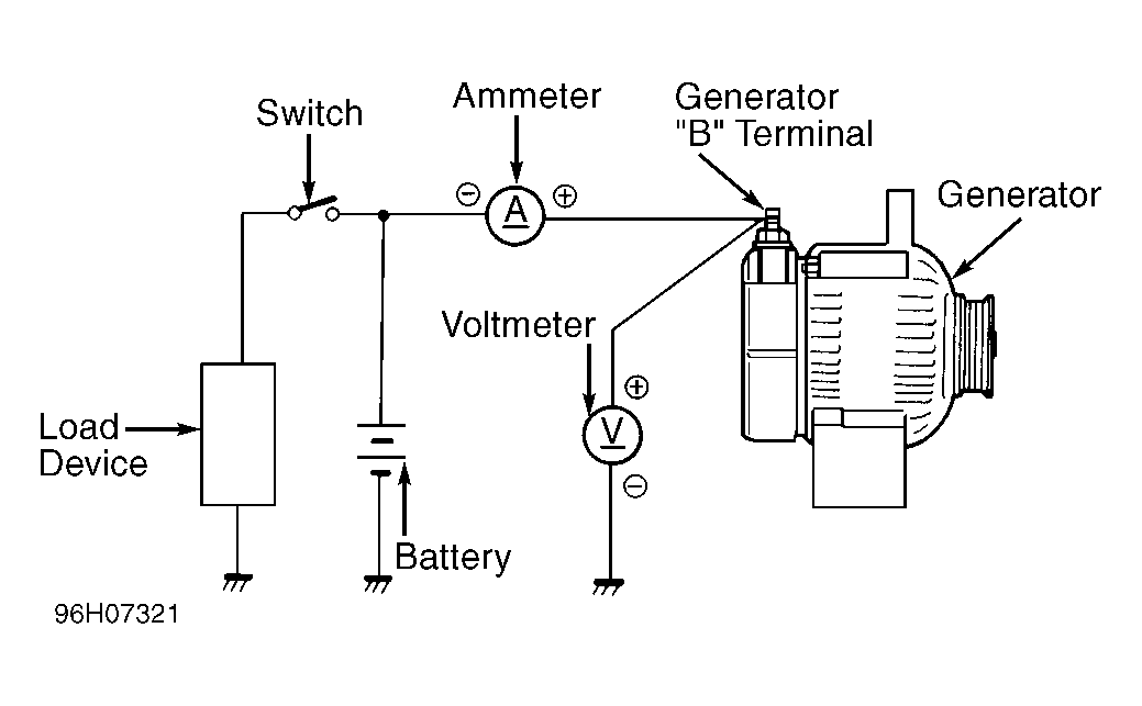 - Connect voltmeter between ground and generator "B" (battery) terminal. Connect ammeter positive lead to generator "B" (battery) terminal. Connect ammeter negative lead to positive battery terminal on the battery. See Fig 1 or Fig 2 .
