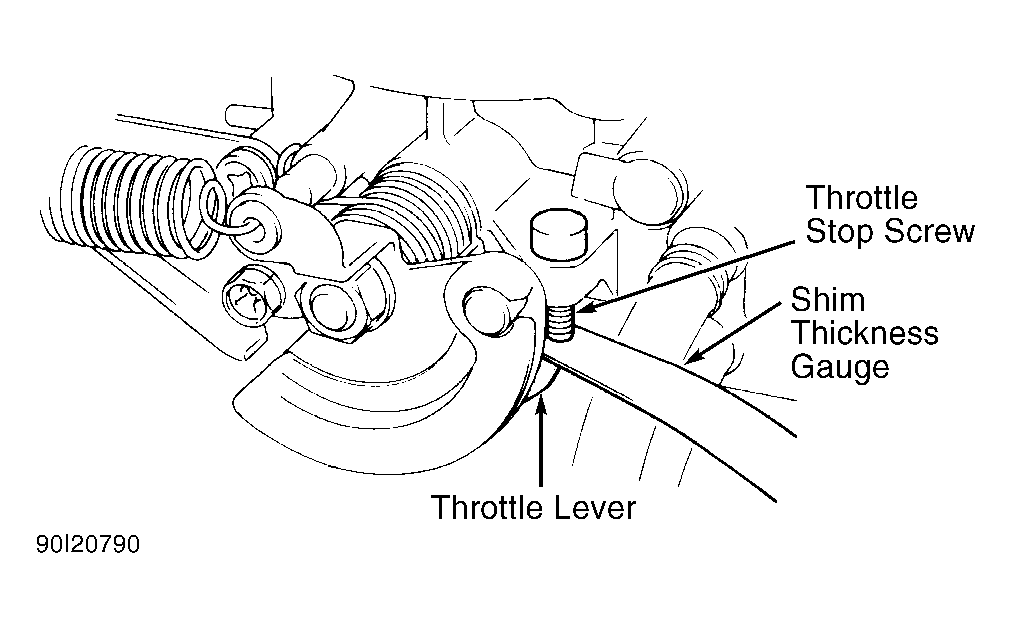 - With voltage measurement equipment still in place, insert 0.14" (3.5 mm) feeler gauge between throttle stop and throttle lever. See Figure. Ensure ISC plunger is not contacting throttle lever screw. Loosen TP sensor screws and rotate back and forth until 0.98-1.02 volts is obtained. Tighten TP sensor screws to 14-21 INCH lbs. (1.6-2.4 N.m). Replace TP sensor if it cannot be adjusted to specification.