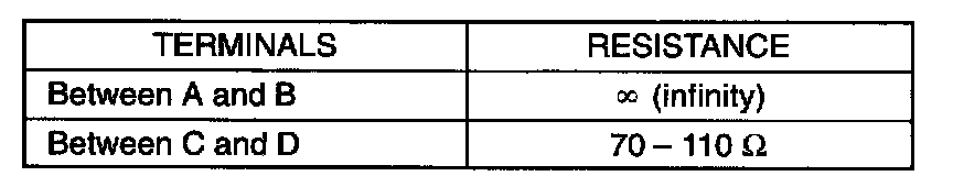 3. Check resistance between each two terminals as in table. If check results are as specified, proceed to next operation check. If not, replace.