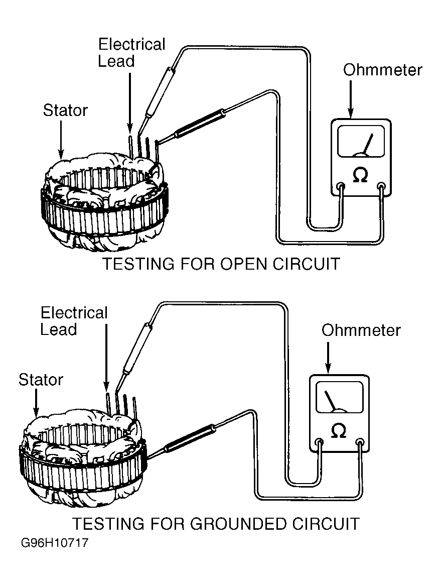 - To test stator for a grounded circuit, use ohmmeter to check for continuity between each electrical lead on stator and the outside of the stator. See Fig 1