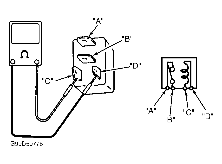 - Energize relay by applying battery voltage and ground to terminals "C" and "D". Check continuity between terminals "A" and "B". If continuity is present, relay is okay. If continuity is not present, replace relay.