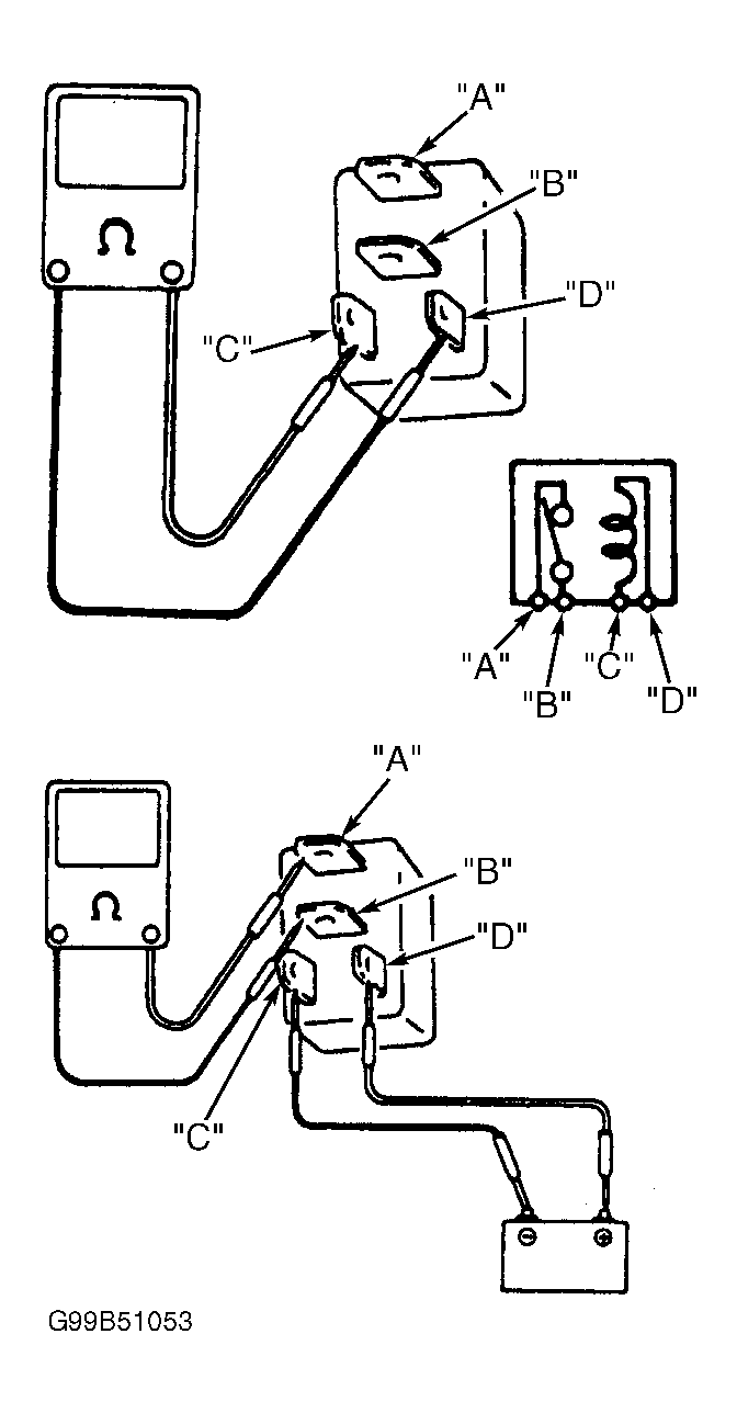 - Turn ignition off. Remove main relay. Inspect and repair relay terminals if necessary. Using DVOM, check continuity between relay terminals "A" and "B". See Fig 1 . No continuity should be indicated. Measure resistance between terminals "C" and "D". Resistance should be 79-95 ohms. Use fused jumper wires to connect battery voltage and ground to terminals "C" and "D". There should now be continuity between terminals "A" and "B". If test results are not as specified, replace main relay. If relay is okay, go to next step.