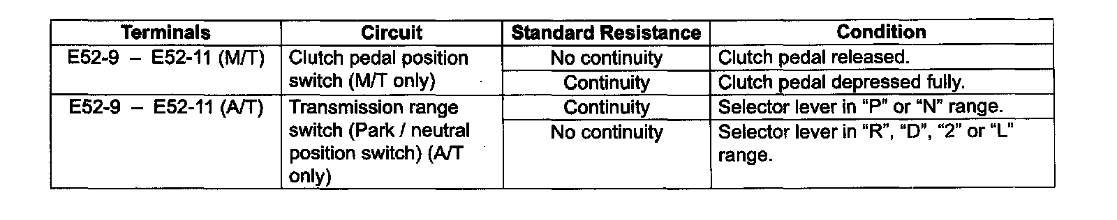 2. Check resistance between each pair of terminals of disconnected connectors as shown in the table.