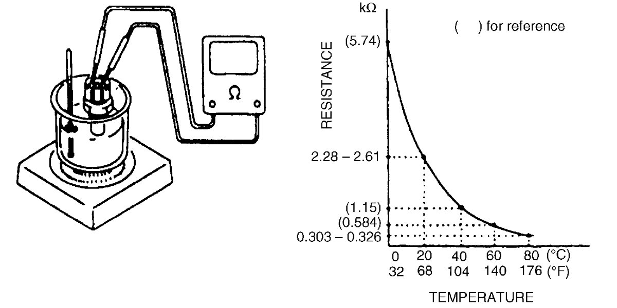 Immerse temperature sensing part of ECT sensor in water and measure resistance between sensor terminals while heating water gradually.