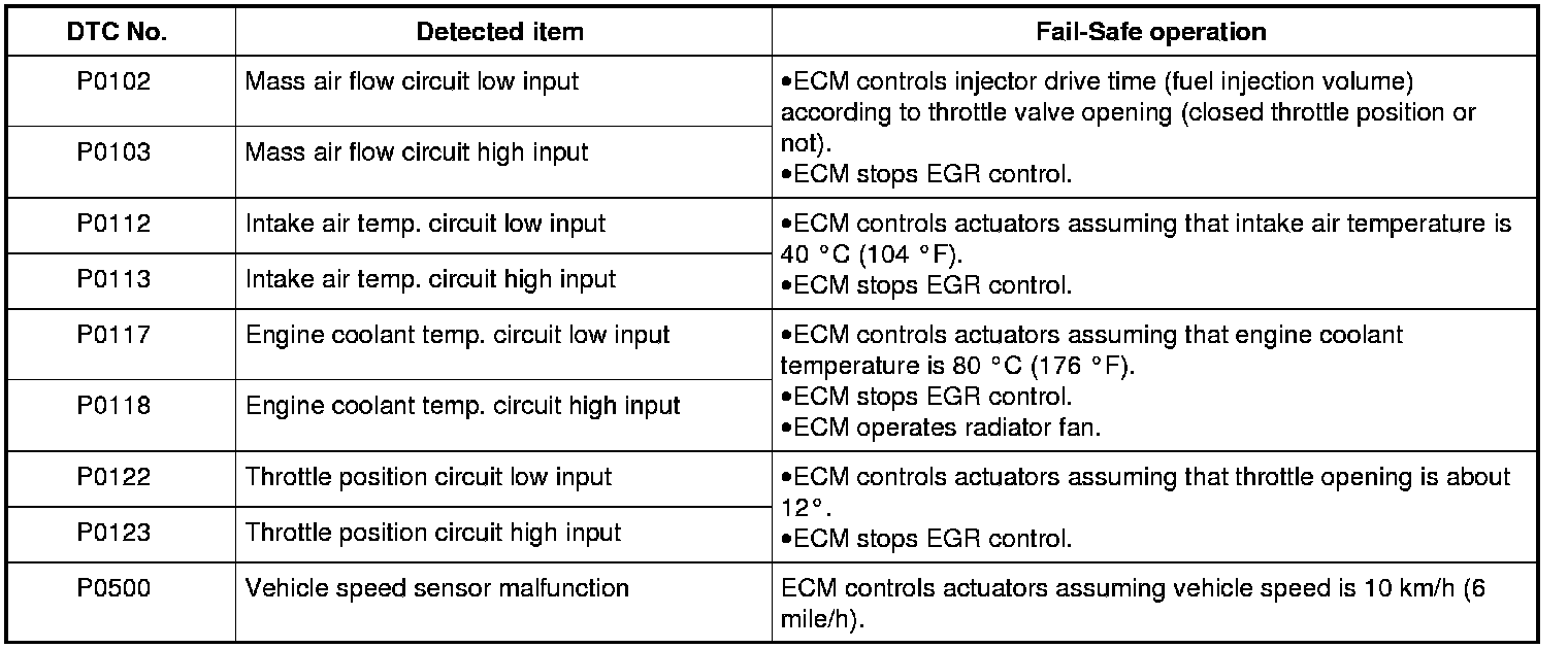 When any of the following DTCs is detected, ECM enters fail-safe mode as long as malfunction continues to exist but that mode is canceled when ECM detects normal condition after that.