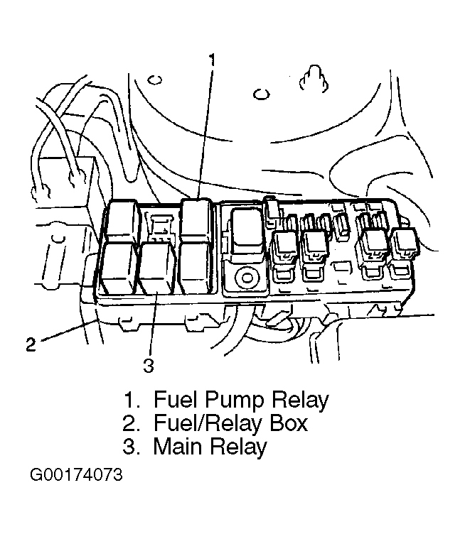 2. Turn ignition off. Remove fuel pump relay from underhood fuse/relay box. See Figure . Check for poor, loose, corroded or damage to main relay socket connections. If problem is found, repair as necessary. If no problem is found, go to next step.