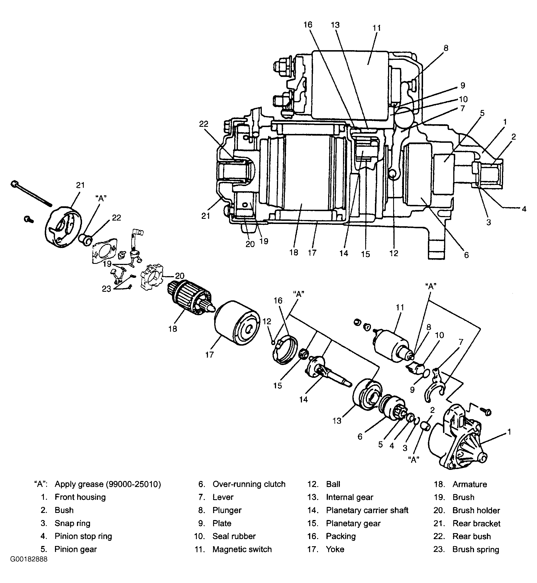 The starter motor consists of parts and has permanent magnets mounted in starting motor yoke (frame). Use exploded view of starter for overhaul. See Fig 1 . The magnetic switch assembly and parts in the starting motor are enclosed in the housings so that they will be protected against possible dirt and water splash.