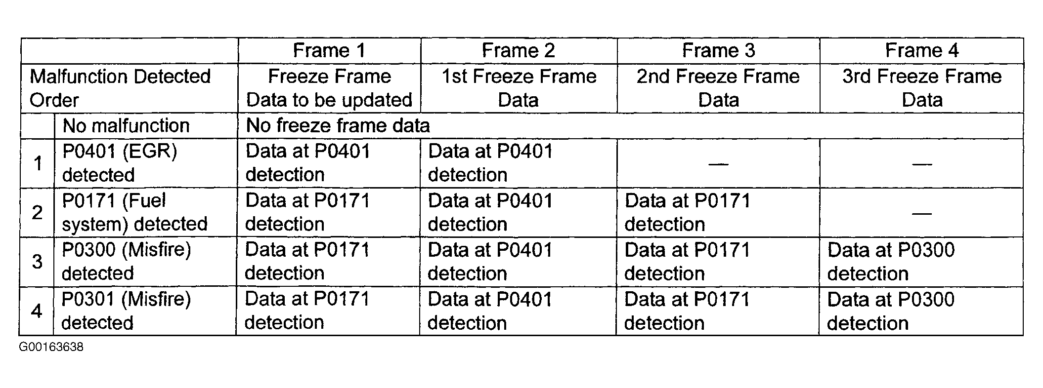 In 2nd through 4th frames, freeze frame data of each malfunction is stored in the order malfunctions are detected. This data is not updated. Examples of how freeze frame data are stored when two or more malfunctions are detected are shown in illustration. See Fig 1.