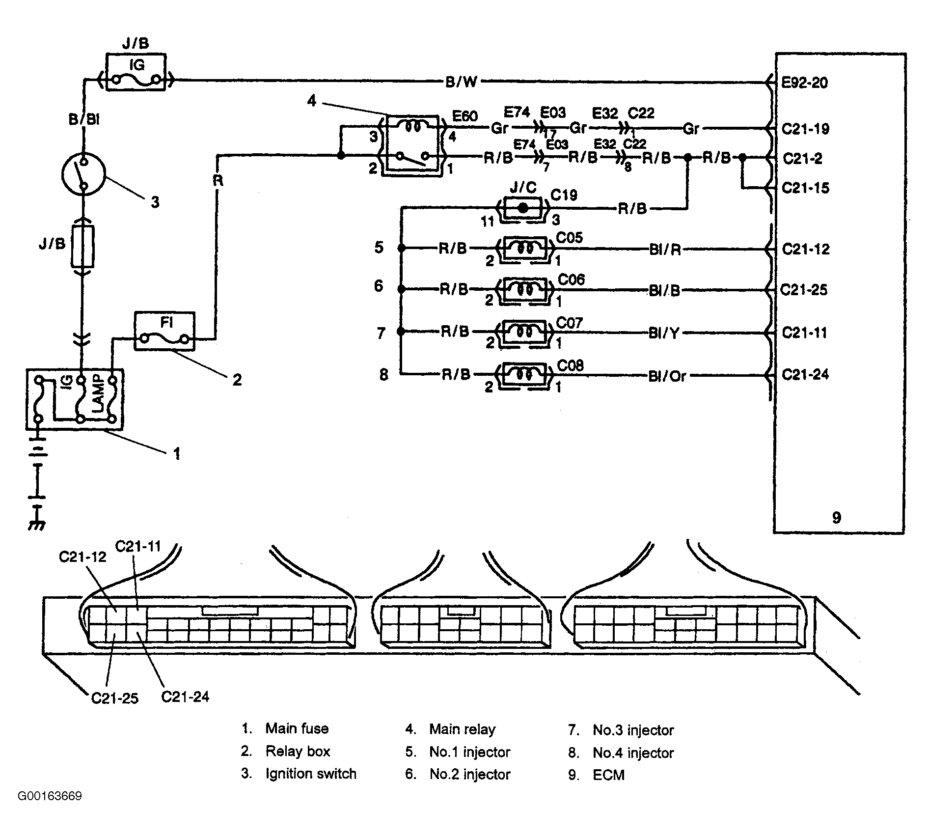 - Turn ignition on. Using test light connected to ground, probe fuel injector harness connector terminal No. 2 (Red/Black wire), at each injector. If test light illuminates, go to next step. If test light does not illuminate, check for open or short in Red/Black wire between fuel injector and main relay. See Fig 1 or Fig 2 . If problem is found, repair as necessary. After repair, retest system.
