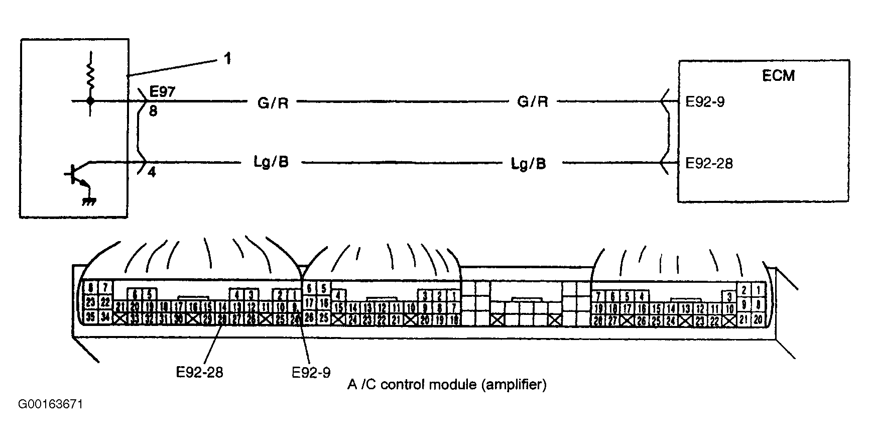 - Check for open or short in Green/Red wire between A/C amplifier and ECM. See Fig 1