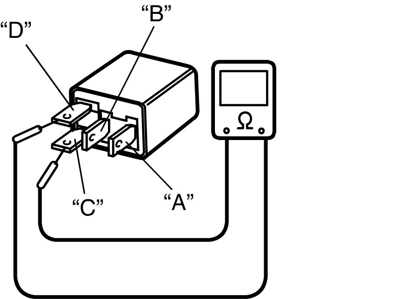Check that there is continuity between terminals "A" and "B" when battery is connected to terminals "C" and "D".