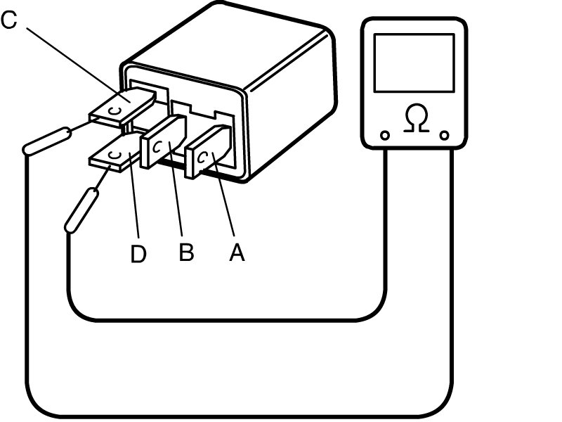 4) Check that there is continuity between terminals "A" and "B" when battery is connected to terminals "C" and "D".