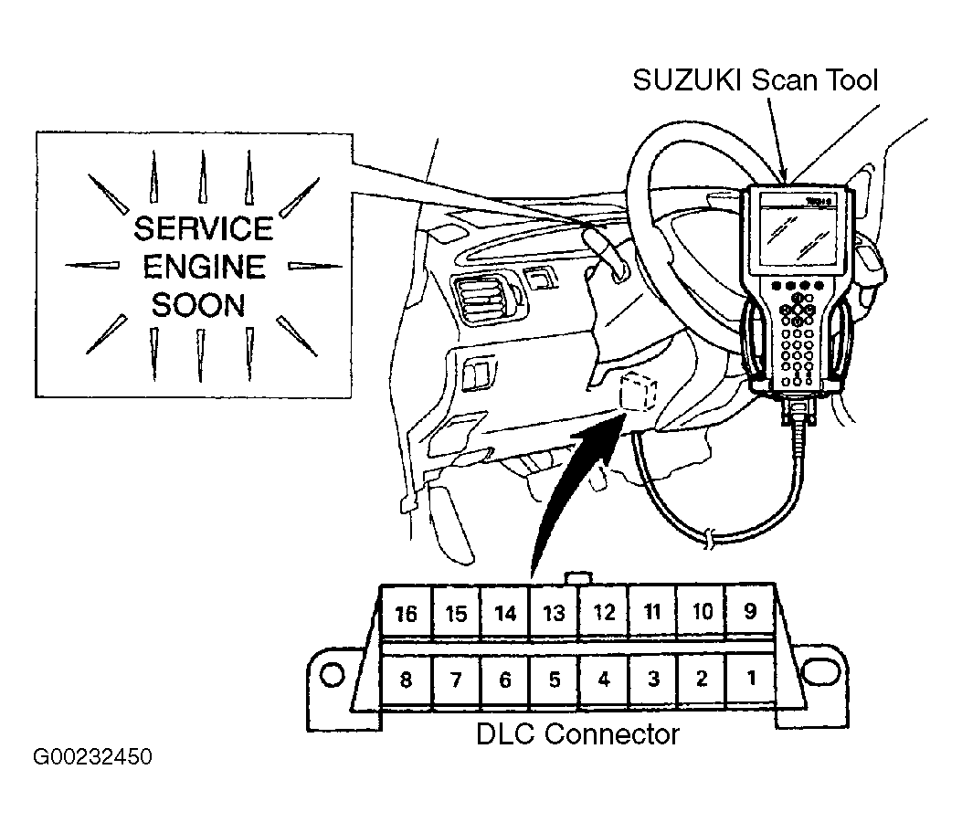 Turn ignition switch to LOCK position. Connect SUZUKI scan tool or equivalent to DLC. See Figure. Turn ignition switch to ON position. Using scan tool, clear DTCs. See CLEARING DIAGNOSTIC TROUBLE CODES  under SELF-DIAGNOSTIC SYSTEM. Start engine and allow it to idle speed for 30 seconds or more. Using scan tool, check for current or pending DTC. See RETRIEVING DIAGNOSTIC TROUBLE CODES  under SELF-DIAGNOSTIC SYSTEM. If DTC P0601 resets, see DIAGNOSIS & REPAIR PROCEDURE .