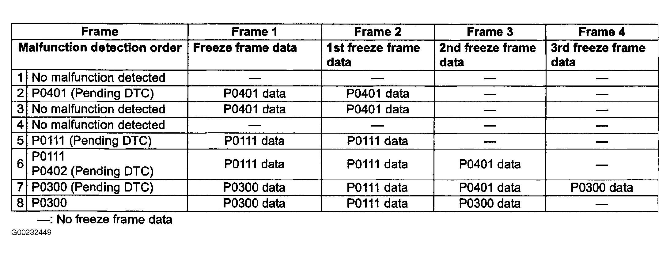 In 2nd through 4th frames, freeze frame data of each malfunction is stored in the order malfunctions are detected. This data is not updated. Examples of how freeze frame data are stored when two or more malfunctions are detected are shown in illustration. See Fig 1.