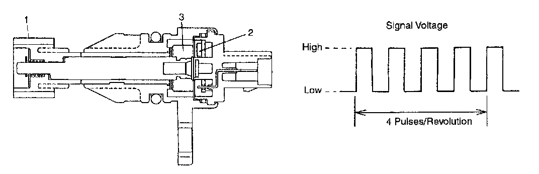 As the sensor gear is turned by drive gear on transfer (or transmission) output shaft, the signal voltage changes from high to low (or low to high). Such High / Low frequency increases in proportion with the vehicle speed and is sent to ECM (PCM) as pulse signals. ECM (PCM) uses it as one of the signals to control various devices.