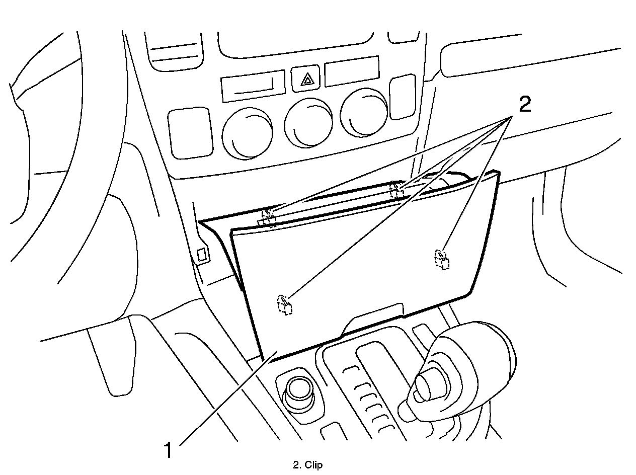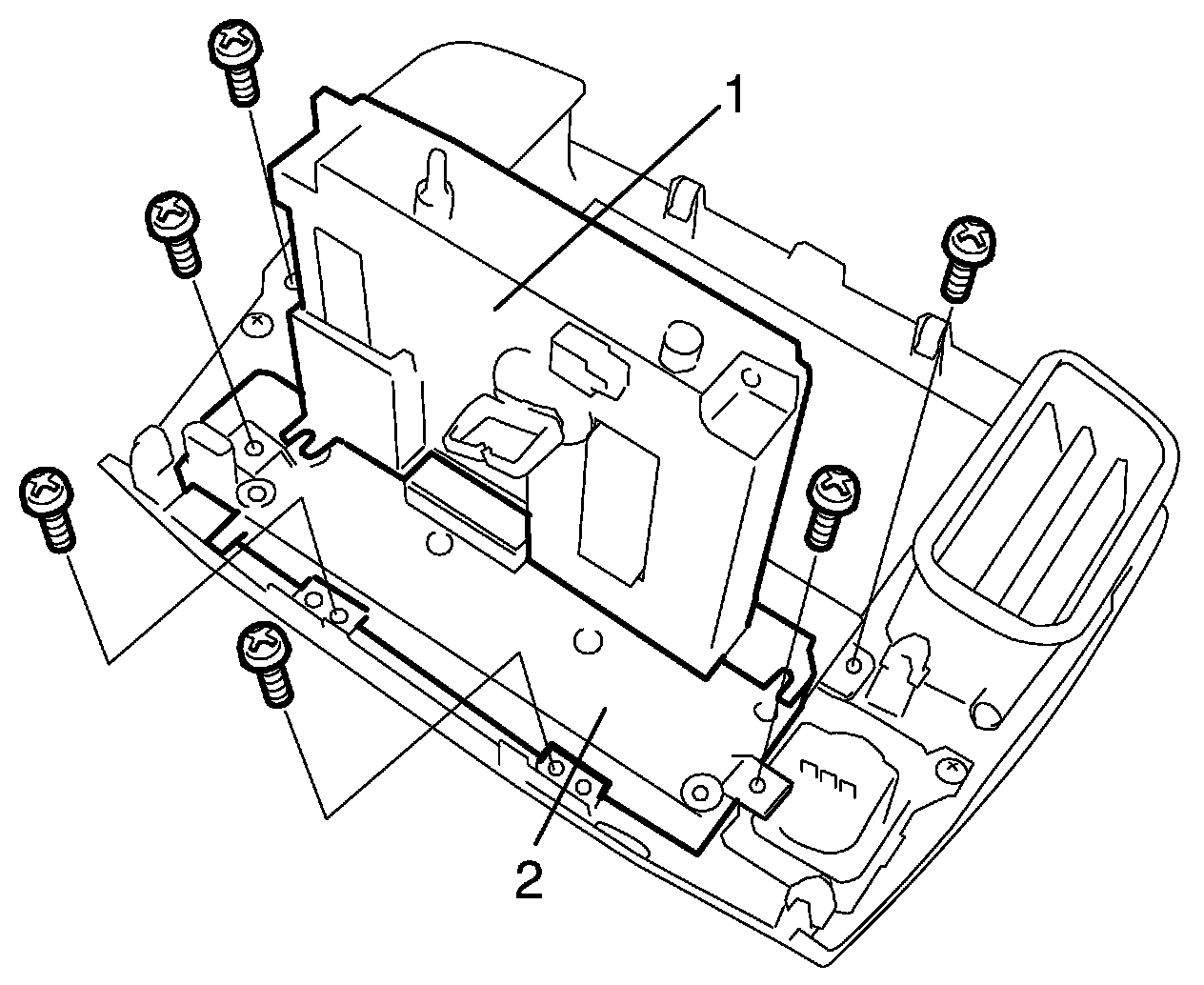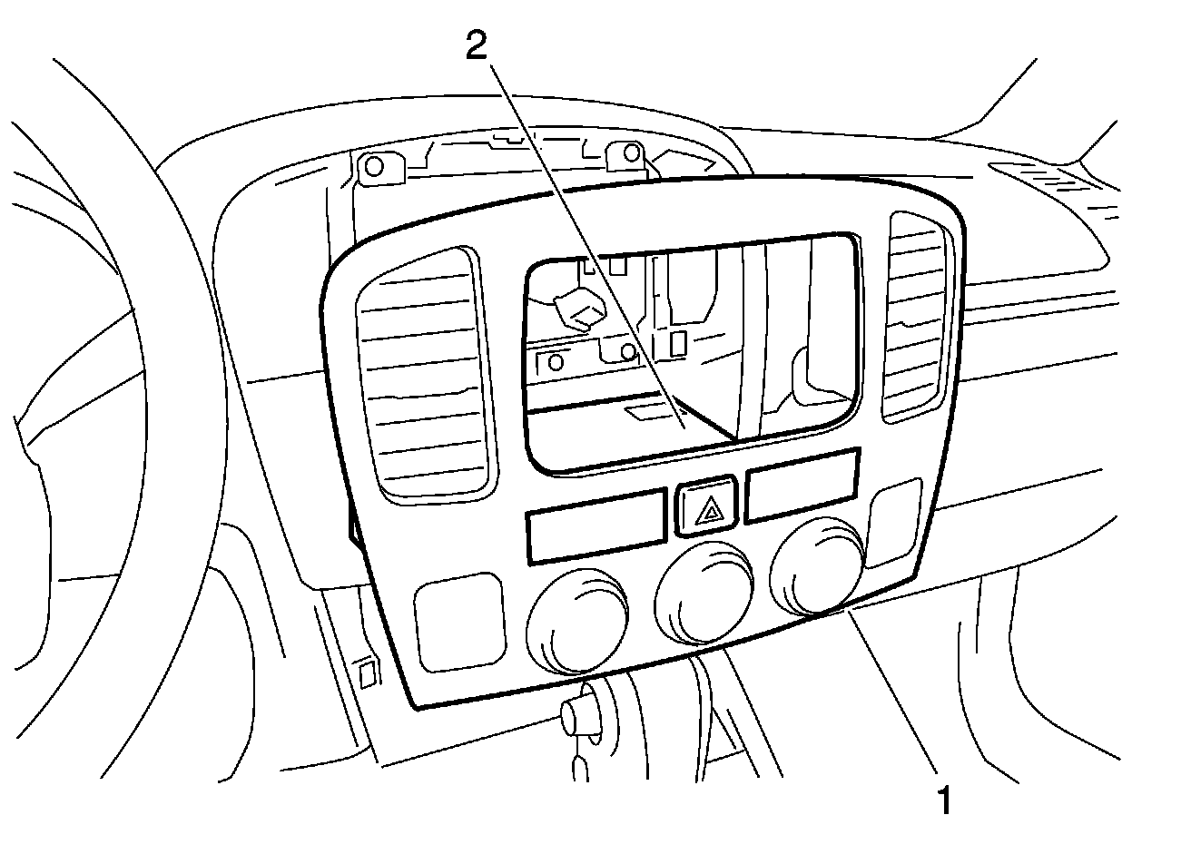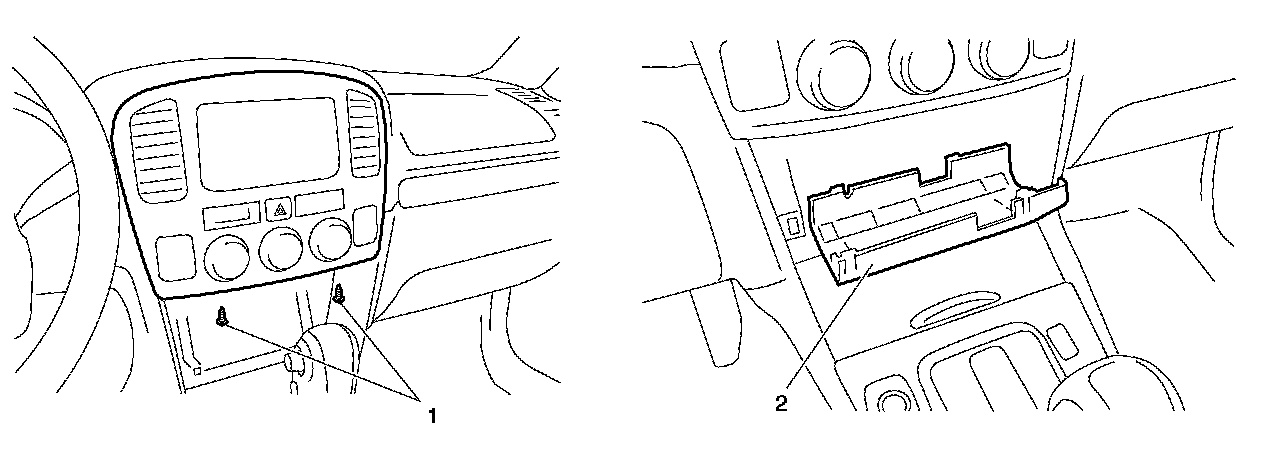 7. Remove center garnish (1) with BCM (2) and HVAC control module.