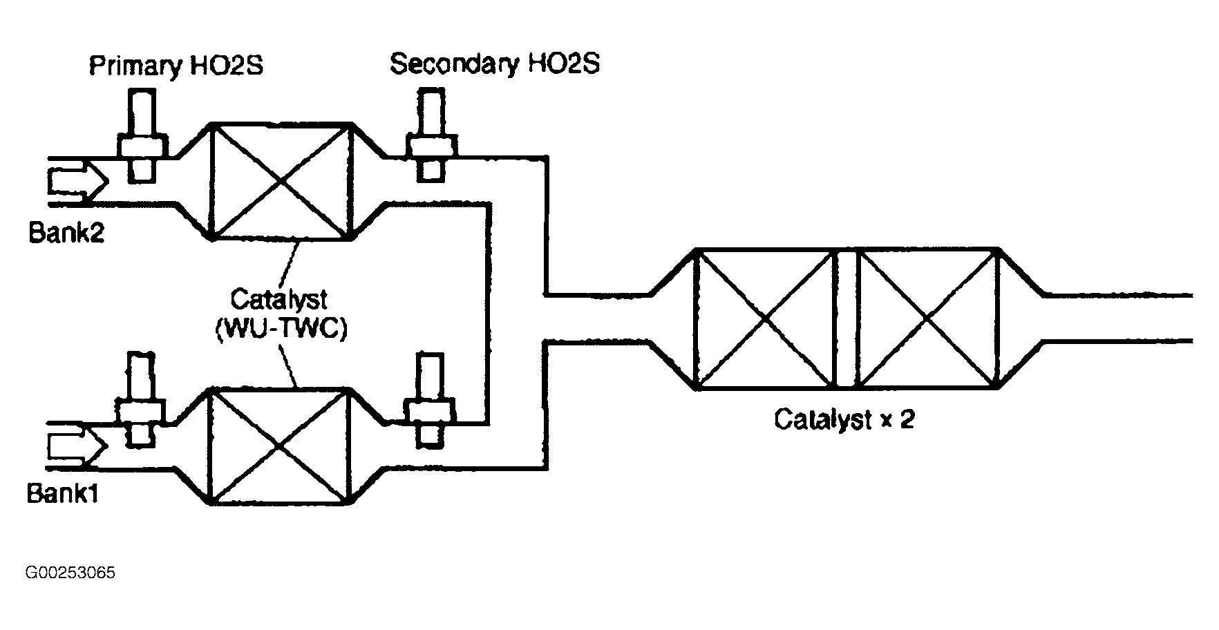 The system has 4 oxygen sensors located upstream and downstream of the catalysts. The layout of catalysts and oxygen sensors is indicated in illustration. See Fig 1.