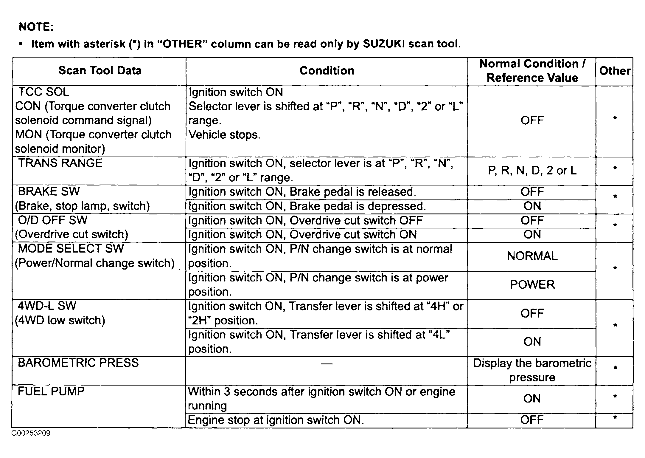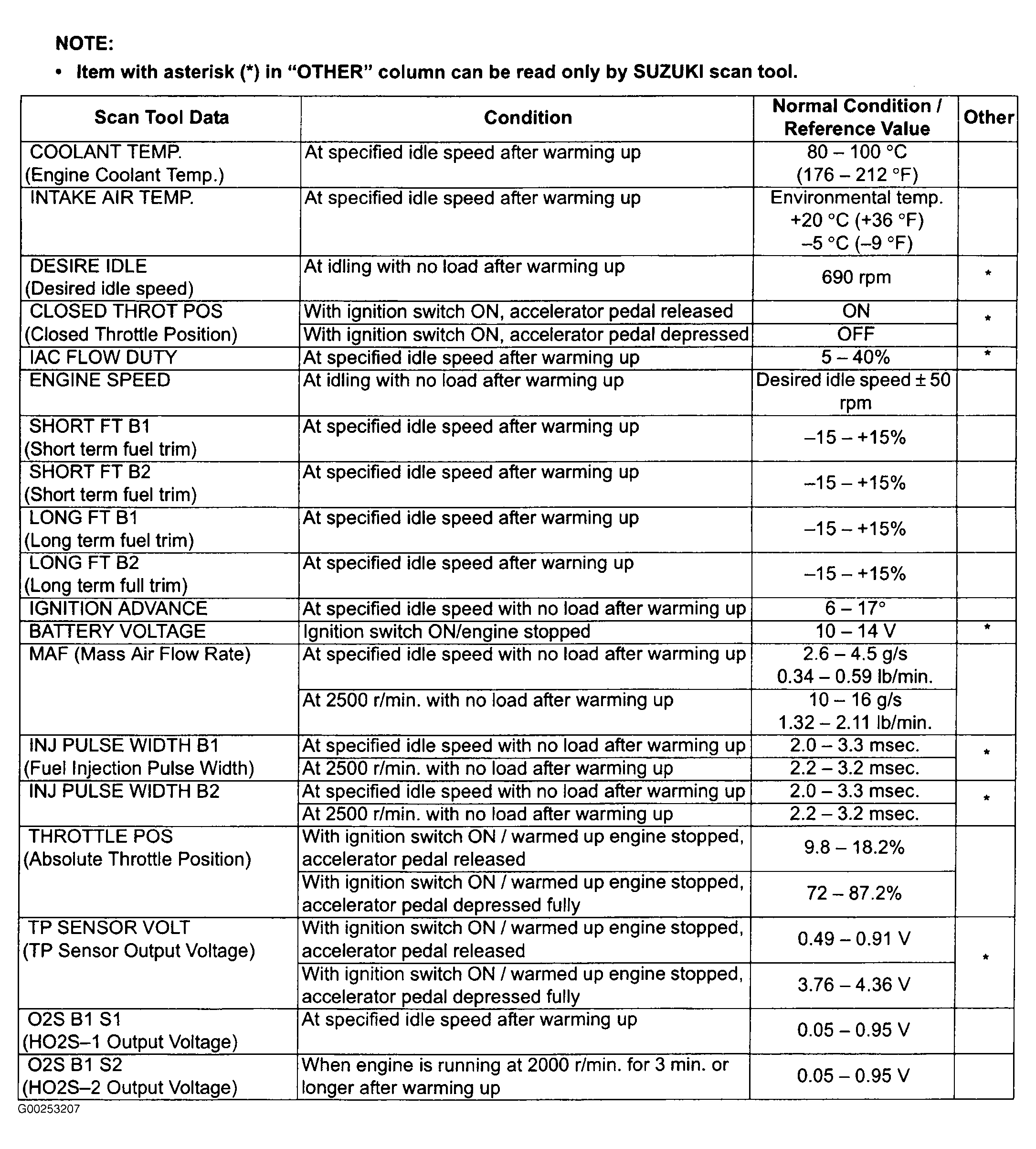 Scan tool data are standard values estimated on the basis of values obtained from normally operating vehicles by using scan tool, use data as reference values. See Fig 1 - Fig 3 . Even when vehicle is in good condition, there may be cases where the checked value does not fall within each specified data range. Judging a component as bad, should not be made by checking with this data alone. Conditions that can be checked by the scan tool are those detected by ECM, along with ECM inputs and output commands. There may be cases where engine or actuator is not operating as indicated by scan tool. With OBD-II generic scan tool, only star marked data can be read. Be sure to use timing light to check ignition timing. When checking scan tool data with engine running at idle or racing, be sure to shift M/T gear to Neutral position and A/T gear to Park position. Engage parking brake fully. If nothing or "no load" is indicated, turn OFF A/C, all electric loads, P/S and all other necessary switches before testing.
