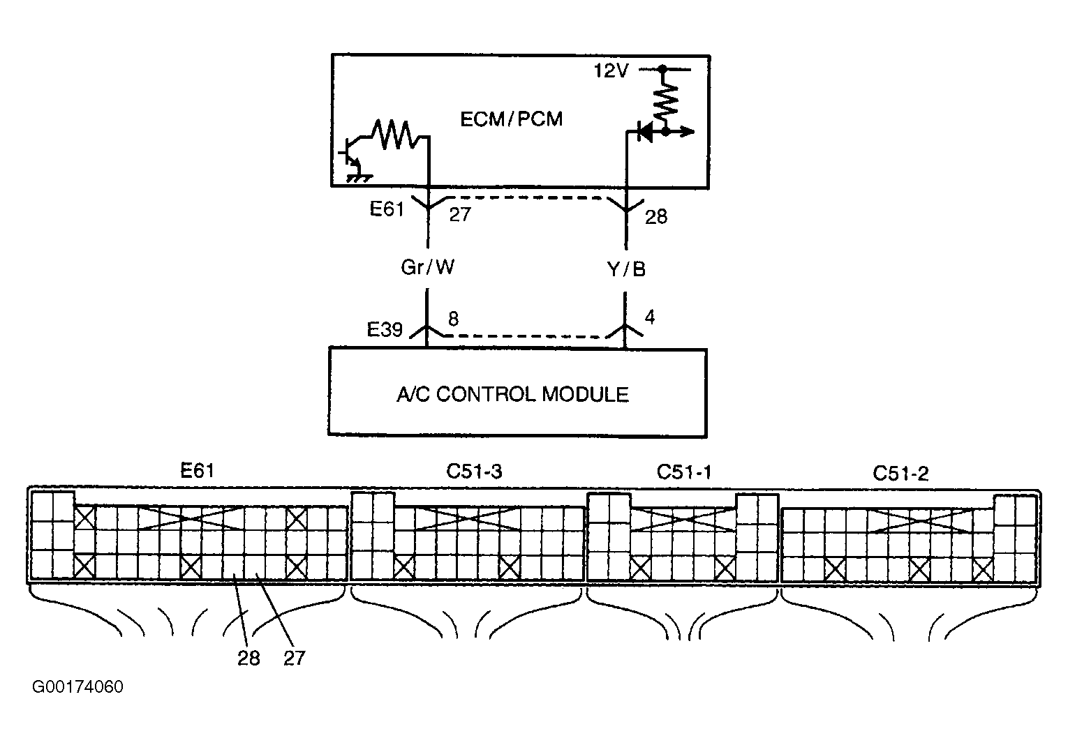 2. Turn ignition on. Backprobing at ECM, measure voltage between ground and ECM connector E61 terminal No. 27 (Grey/White wire). With A/C and blower switch Off, voltage should be 0-1 volt. With A/C and blower switch On, voltage should be 10-14 volts. If voltage readings are as specified, A/C circuit s are okay. If voltage readings are not as specified, go to next step.