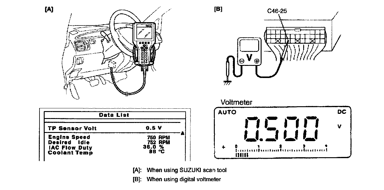 4. When SUZUKI scan tool and cartridge are available, set them to DLC with ignition switch OFF. When they are not available, remove ECM and with couplers connected to ECM, connect digital type voltmeter as shown in figure.