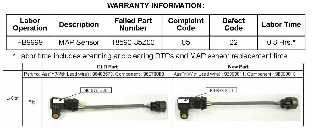 The new MAP sensor port has been enlarged to prevent condensation from covering the port and freezing. Replace the MAP sensor with the updated part shown. Use scan tool to clear all DTCs from the ECM memory.